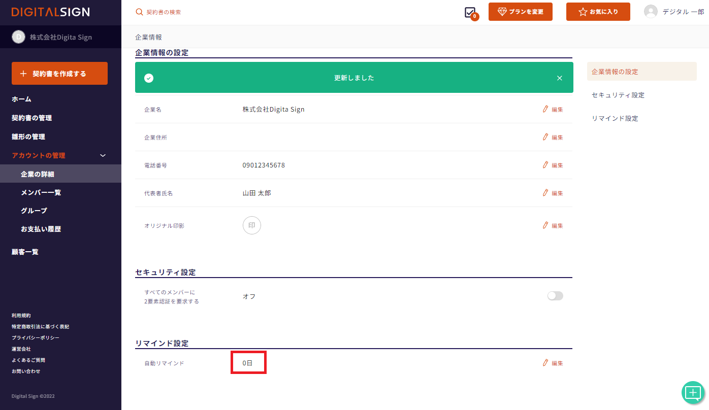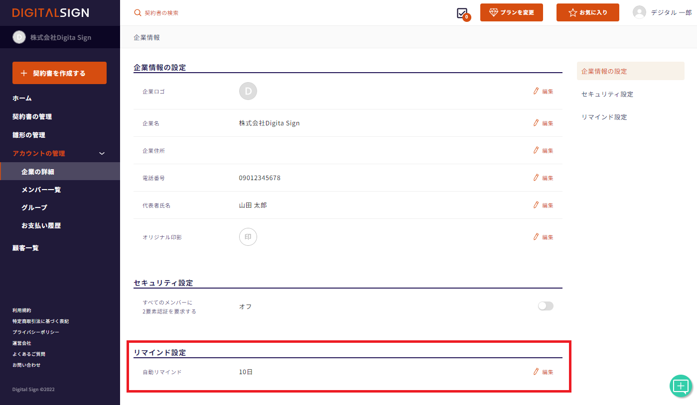 アカウントの管理 > 企業の詳細 から、「リマインド設定」の編集ボタンをクリックします。