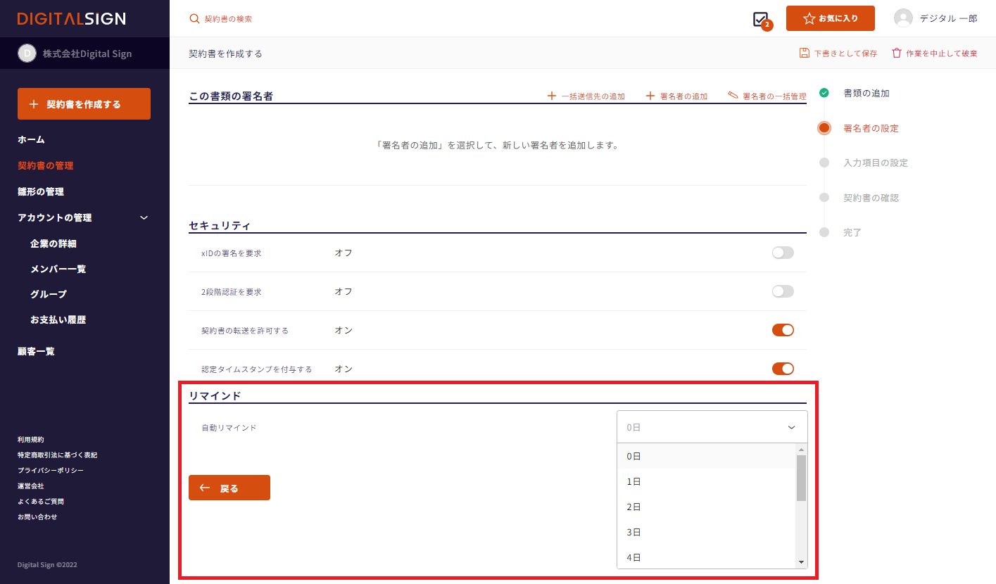 経過前に署名が完了した場合は送信されません。 - リマインドメールを送信しない場合は、0 日を指定してください。