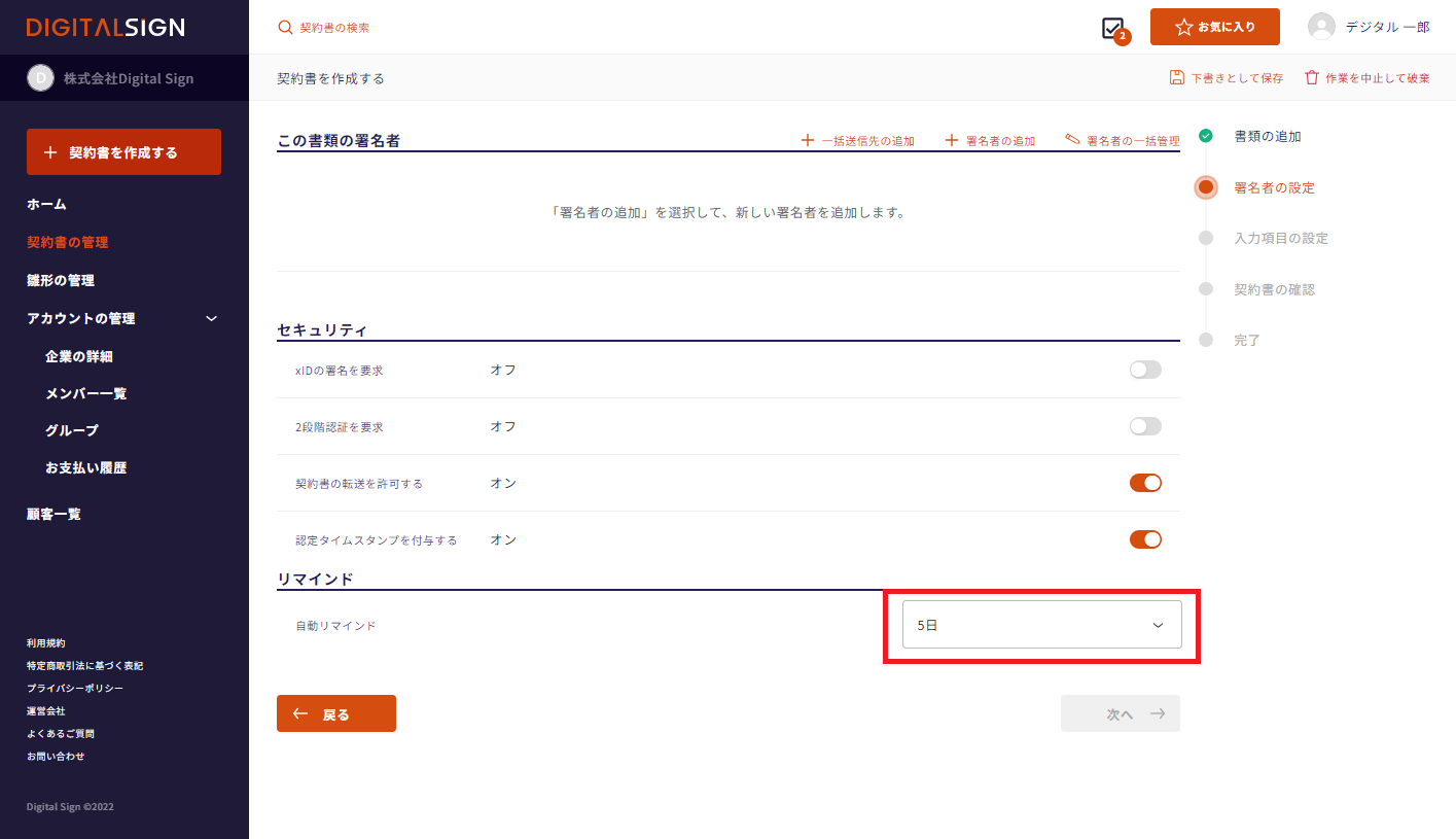 契約書作成画面の「署名者の設定」ページ下部の「リマインド」で設定可能です。