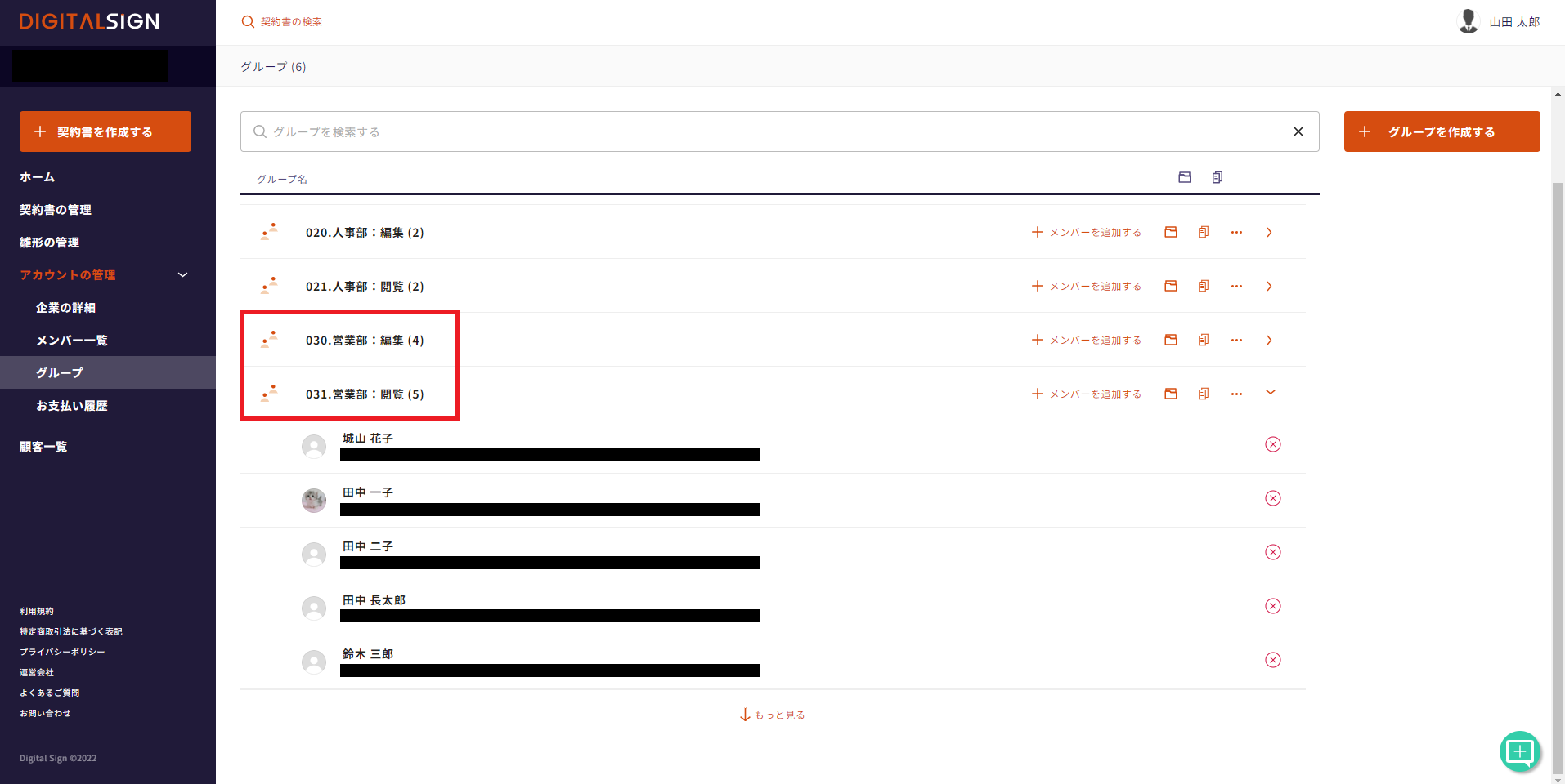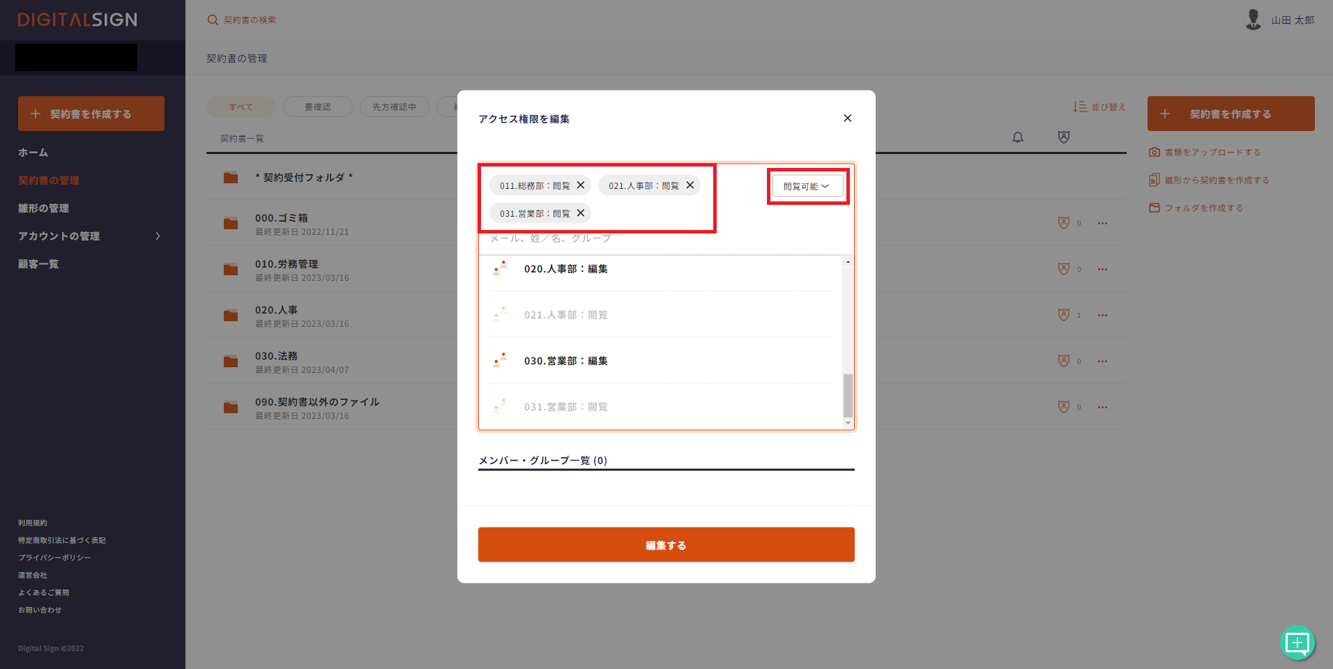 2. フォルダ/契約書に、各グループの権限を設定します。