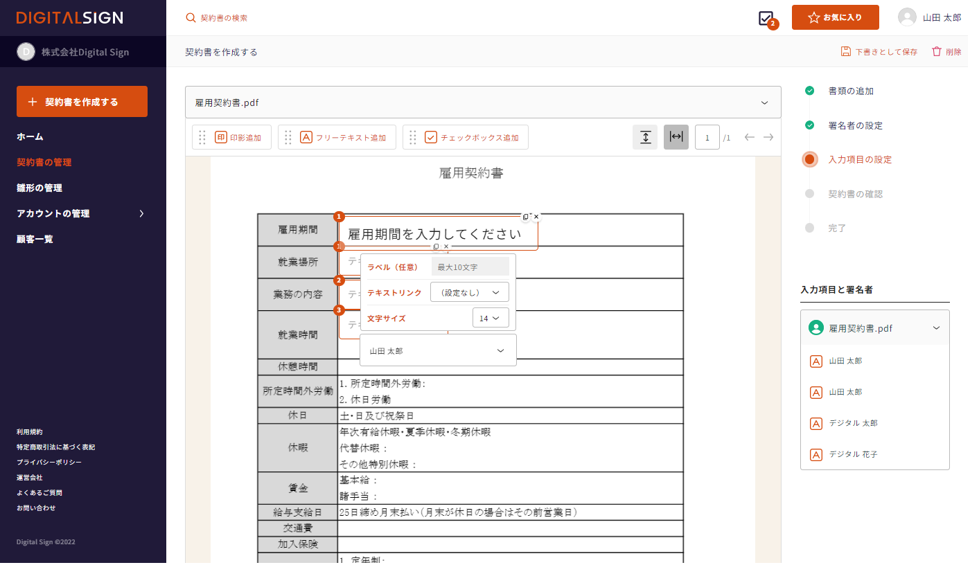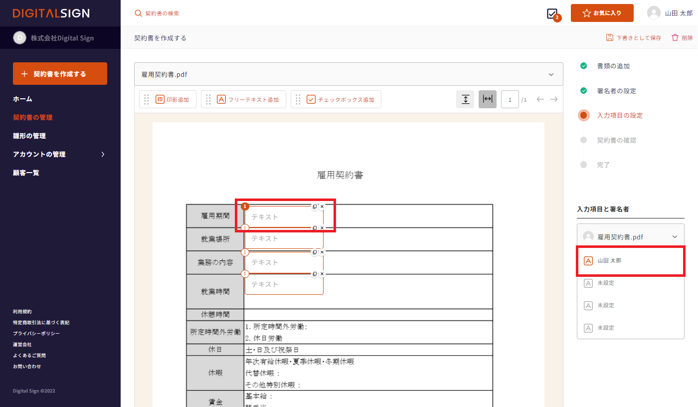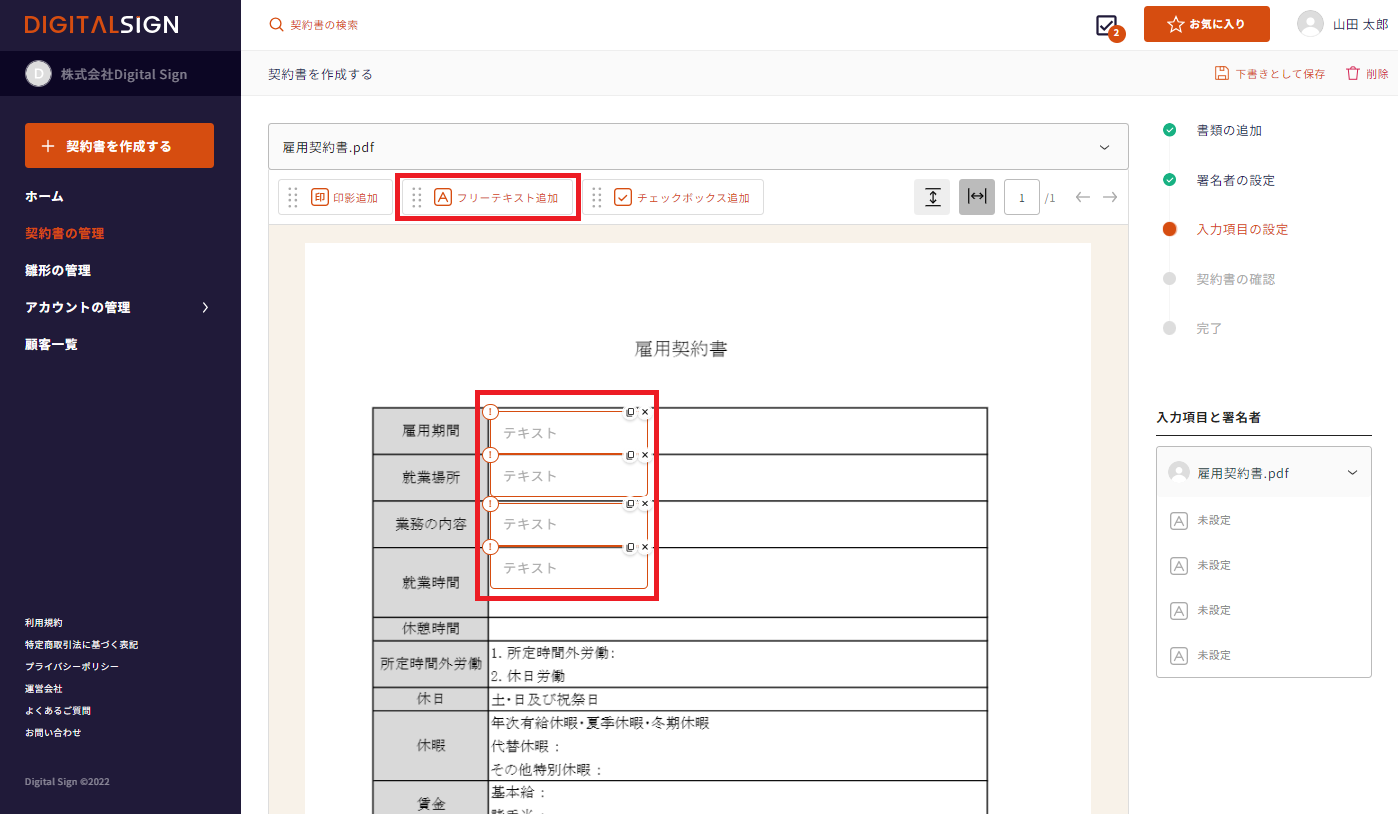 契約書の作成画面 -> 入力項目の設定 から「フリーテキスト追加」をクリック、またはドラッグアンドドロップで所定の位置に配置します。