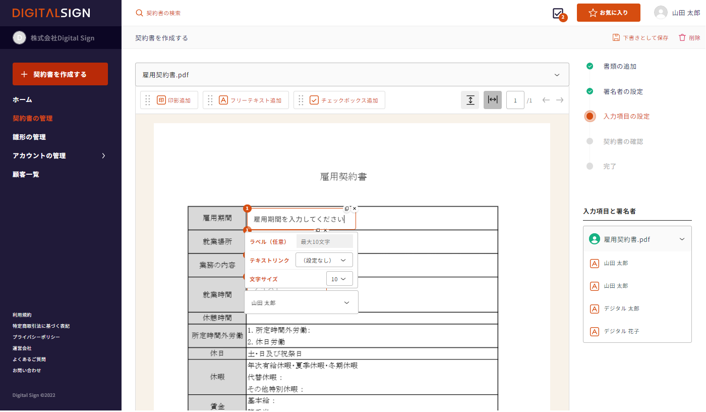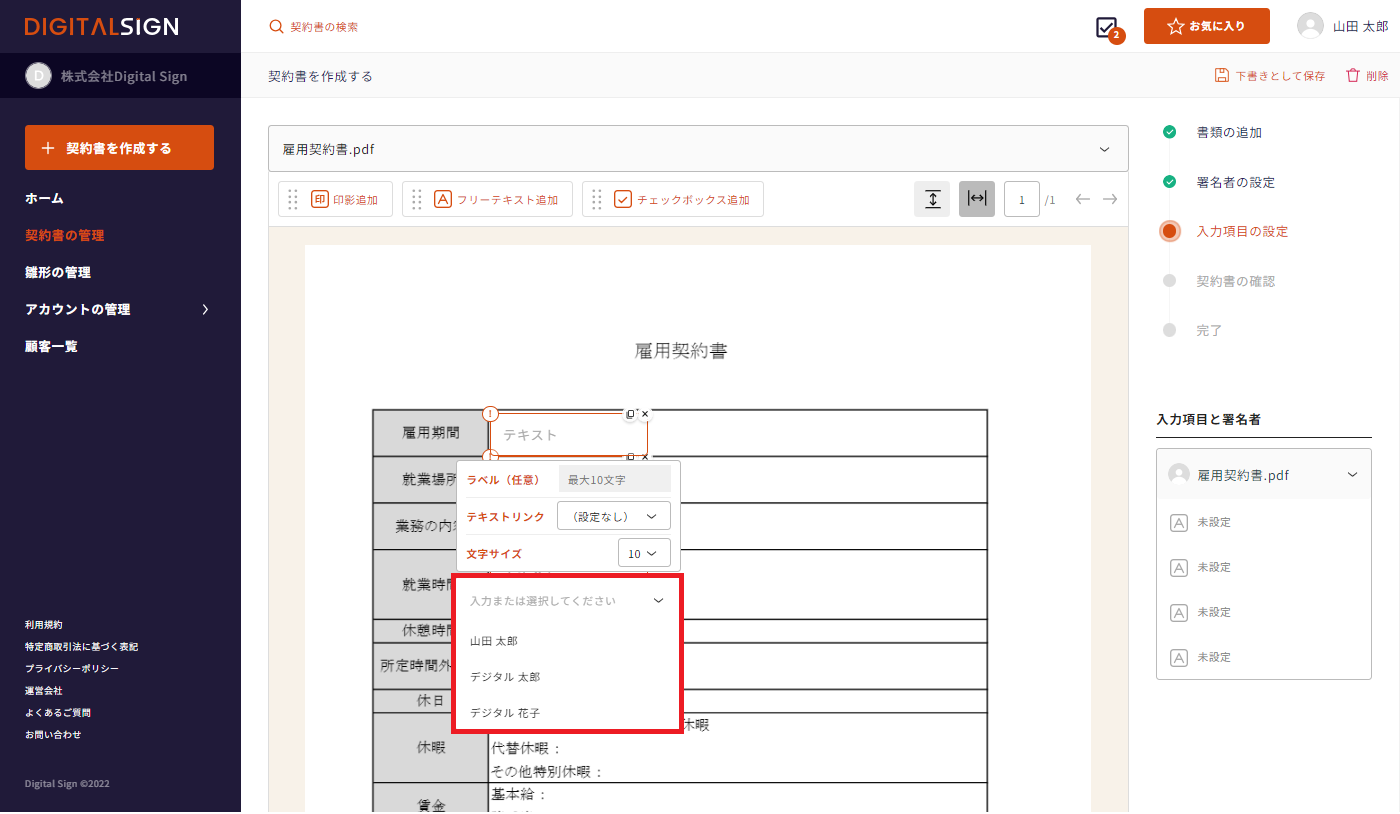 ※署名者を設定すると、入力項目と署名者一覧に、設定した署名者名が表示されます。