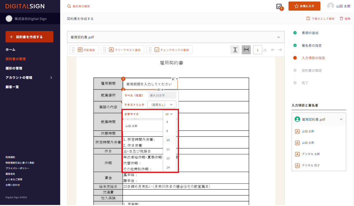 契約書の文字サイズとフリーテキストの文字サイズを合わせる場合は「文字サイズ」をクリックし、任意のサイズを設定します。