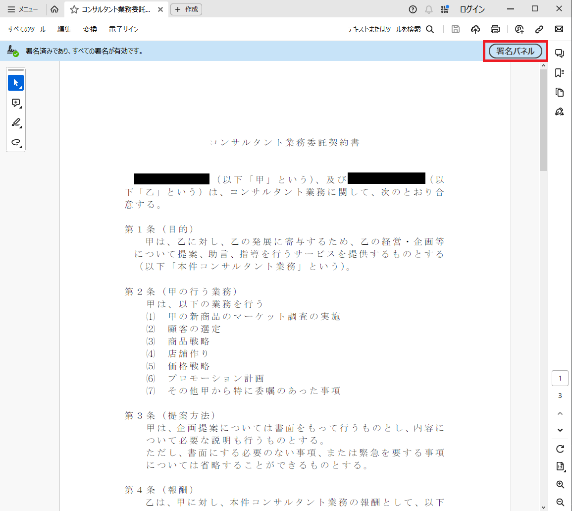 - ダウンロードしたAcrobatReaderでファイルを開き、「署名パネル」をクリックします。