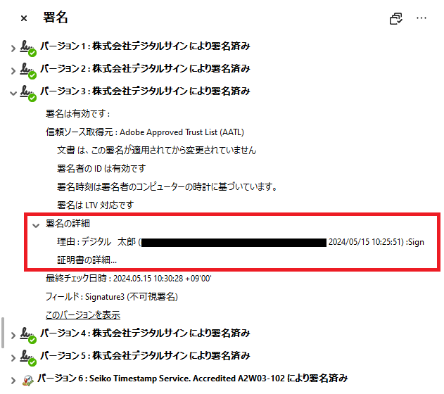 画像赤枠の箇所にて、電子署名をした人の情報を確認できます。